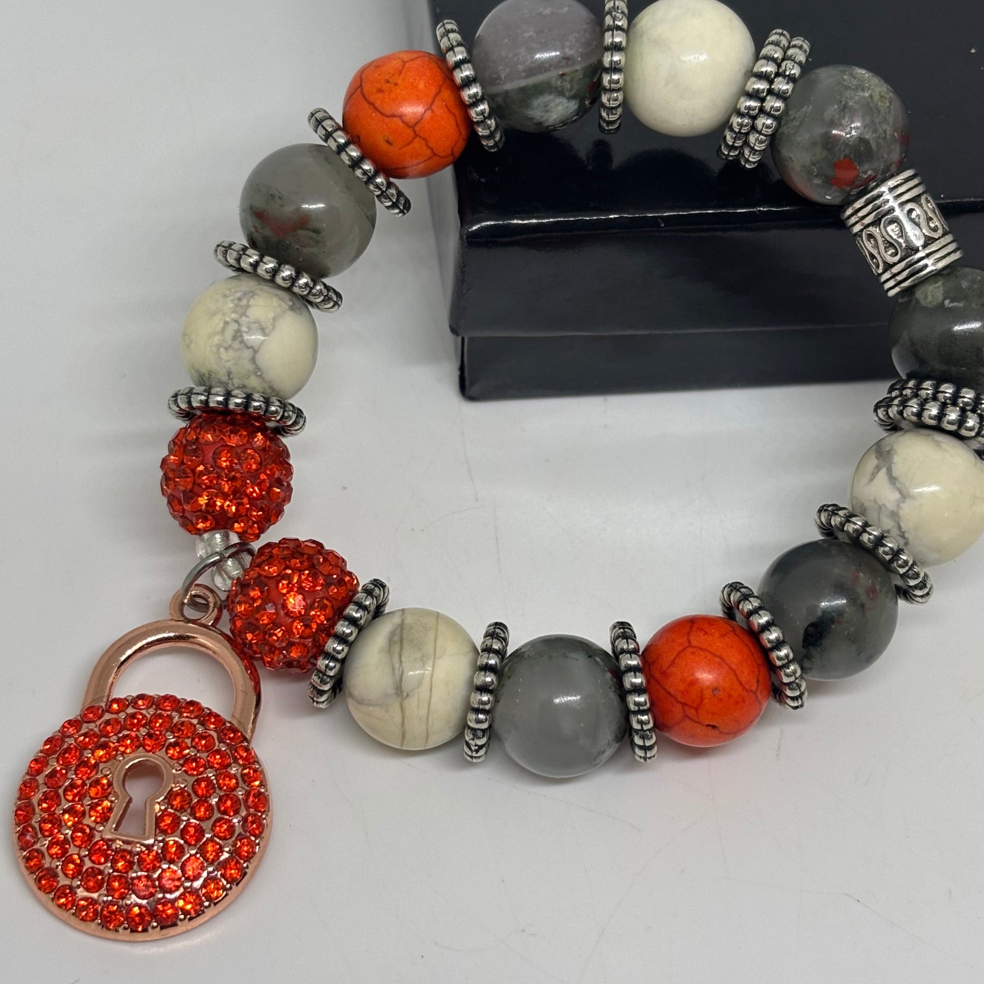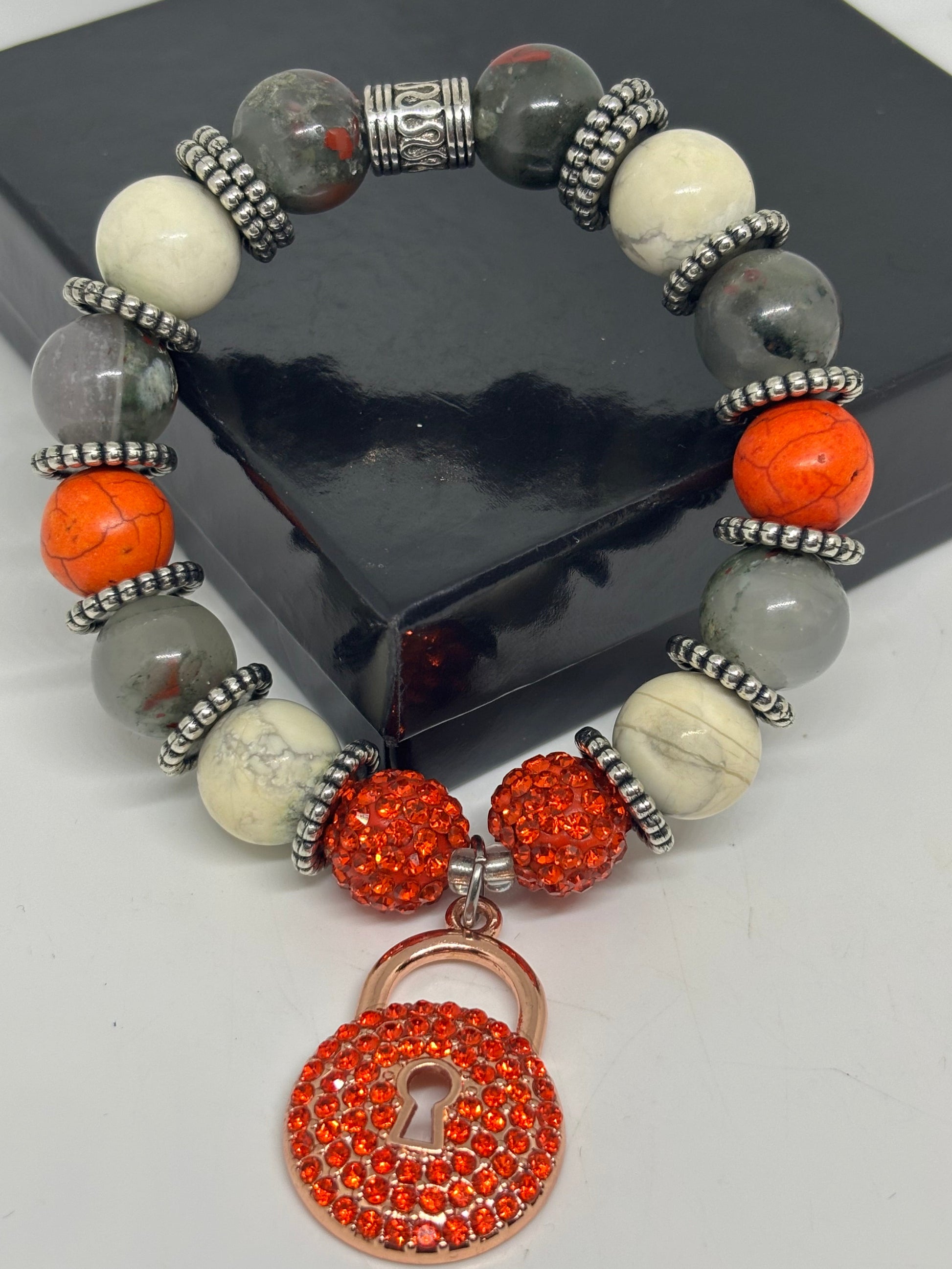 - A bold blend of orange, gray, and white stones accented with silver spacers and crystal-studded lock charm, symbolizing protection, strength, and guarded energy.