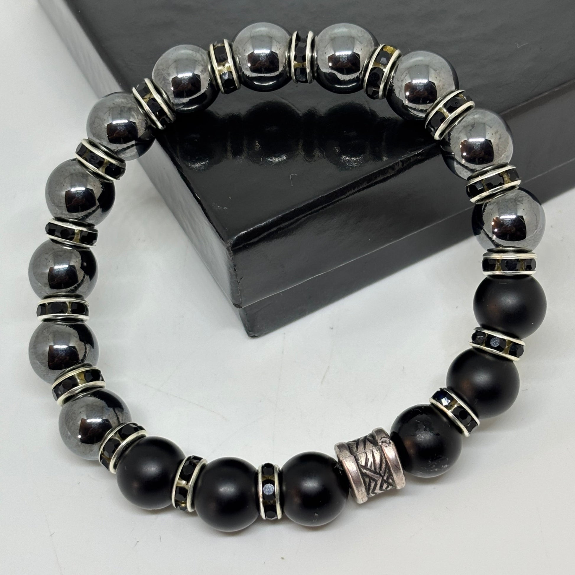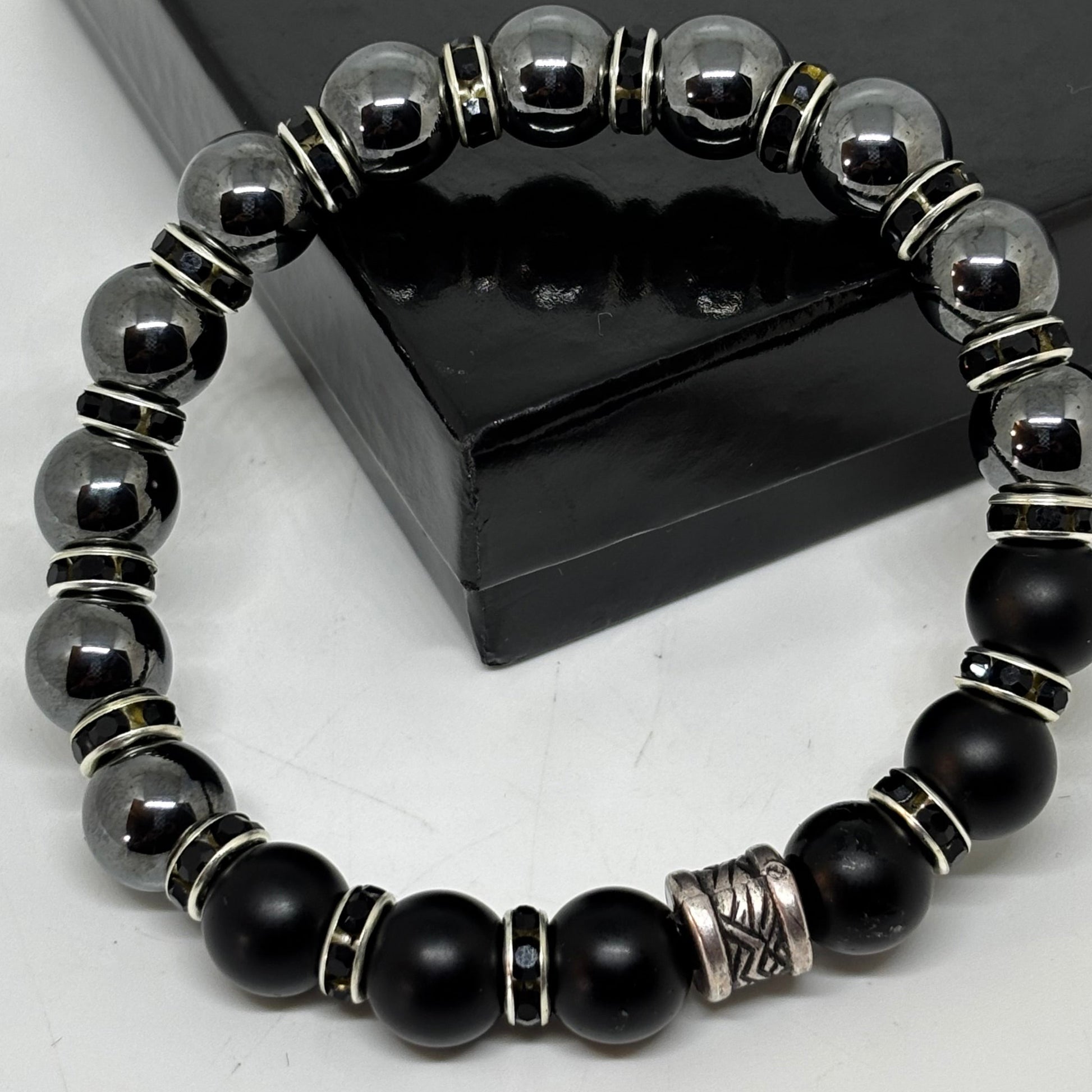 - Sleek bracelet high-shine gunmetal hematite beads accented with matte black beads black rhinestone spacers. Designed for modern elegance, it delivers a refined statement with a touch of boldness.