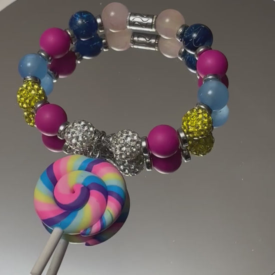 Fun and colorful kids bracelet featuring a rainbow lollipop charm, sparkly accents, and bright beads perfect for adding a sweet touch to any little princess outfit!
