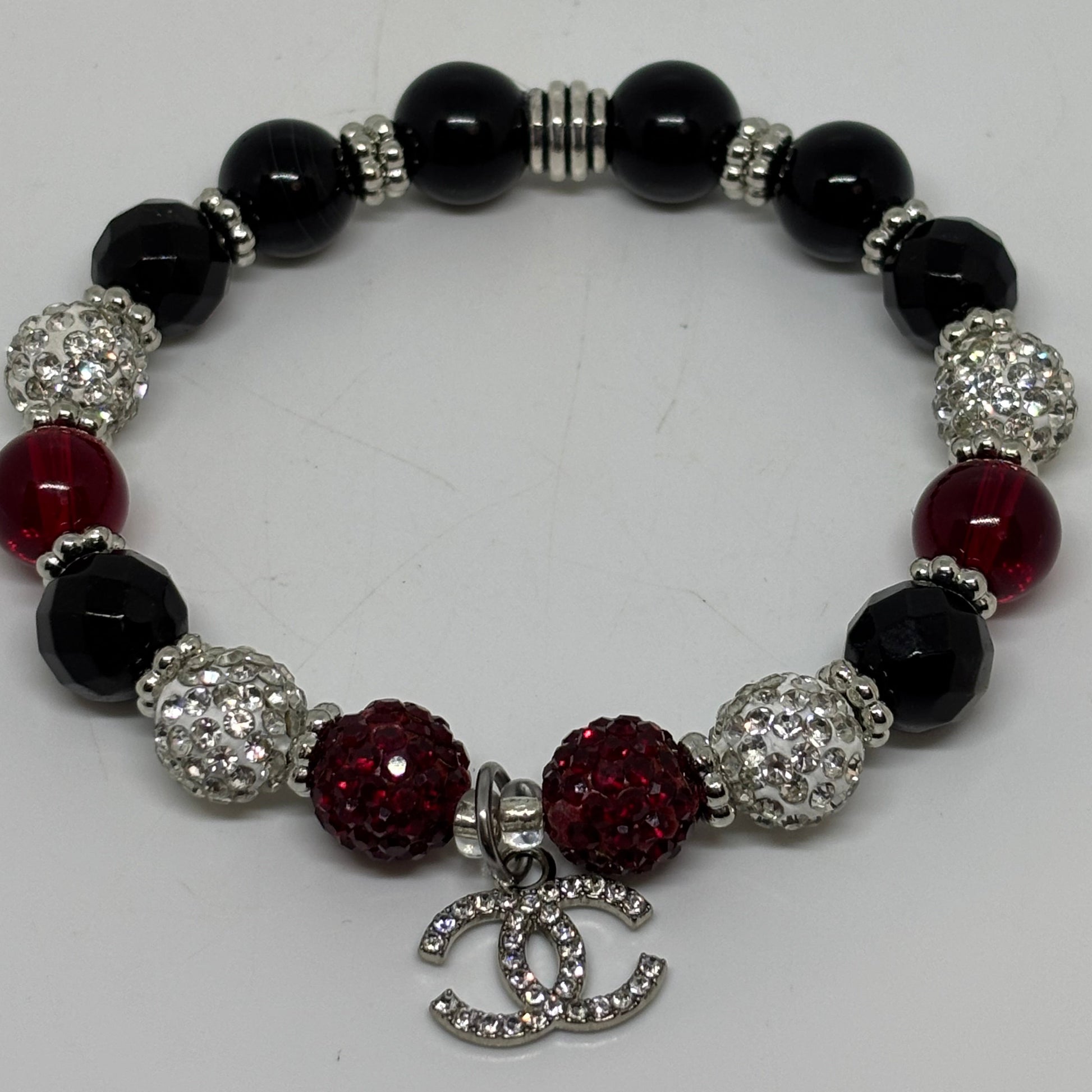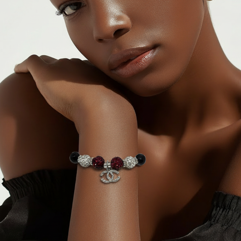 - Sophisticated bracelet featuring deep, red crystal beads, glossy black accents and a sparkling rhinestone spacer finished with a classic inspired Chanel charm. This piece delivers timeless luxury with a bold glamorous edge.