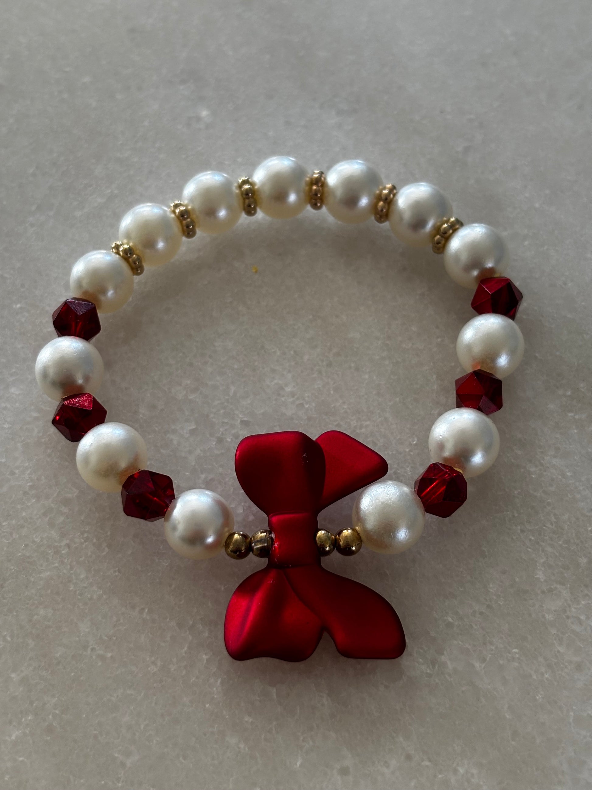 - Add a touch of elegance and charm to your look with this handcrafted stretch bracelet. Designed with luminous ivory pearl beads, red and gold accents, and a striking red bow centerpiece, this bracelet blends classic beauty with a playful statement.