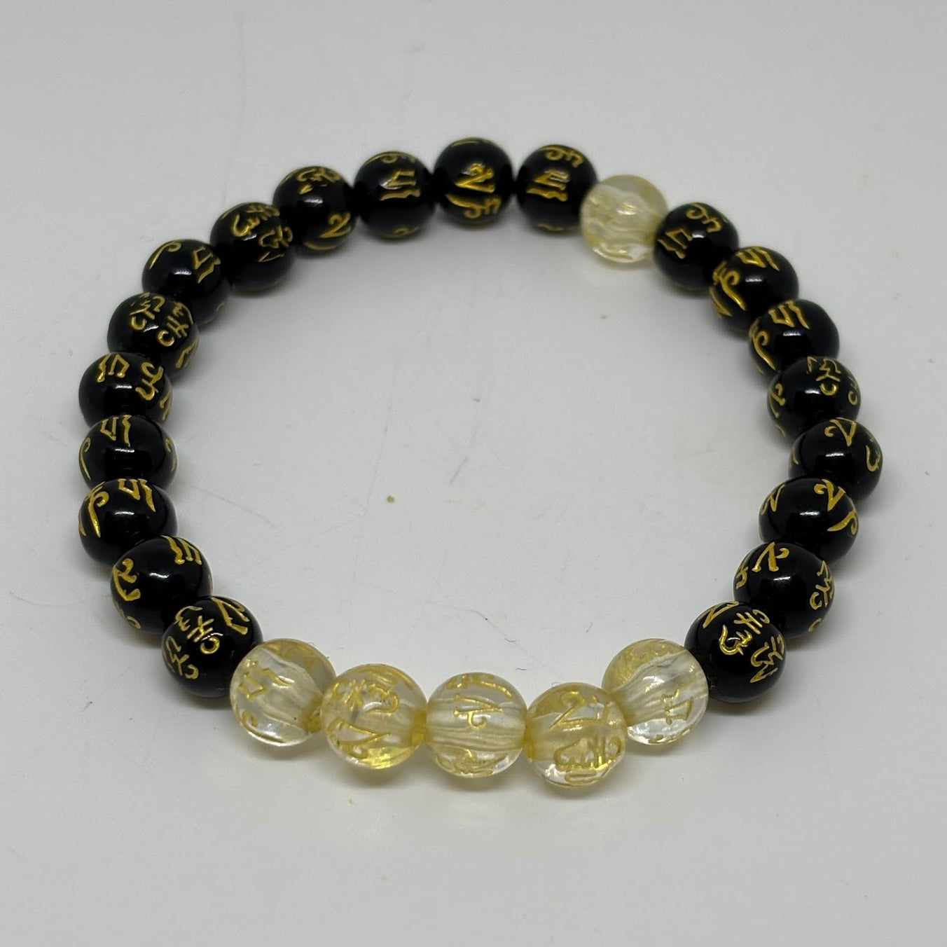 - Elegant unisex bracelet featuring glossy black beads with gold inscriptions paired with clear golden citrine-style stones. A perfect blend of balance and energy, symbolizing prosperity, clarity, and inner peace.