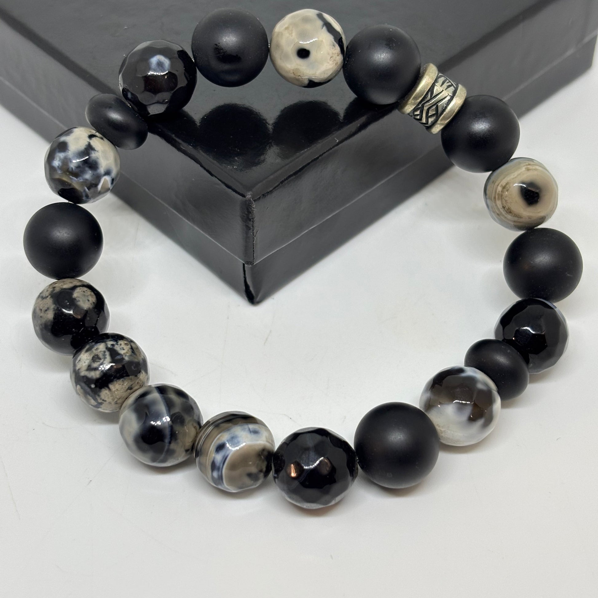 - Bold men’s bracelet features a striking mix of black matte beads, grey marbled jasper, and textured for a modern edge. Designed to elevate any look, this piece blends rugged style with natural stone elegance.