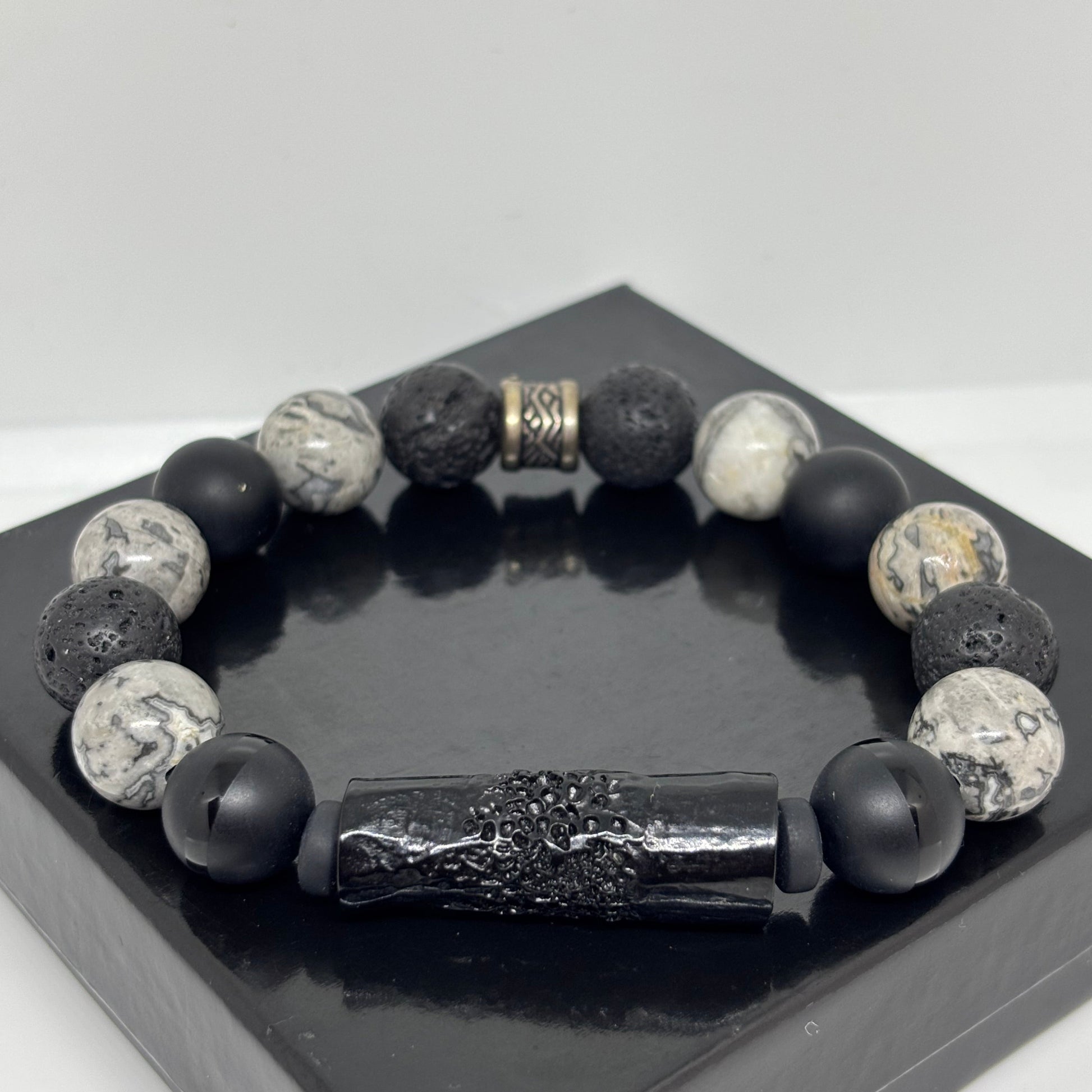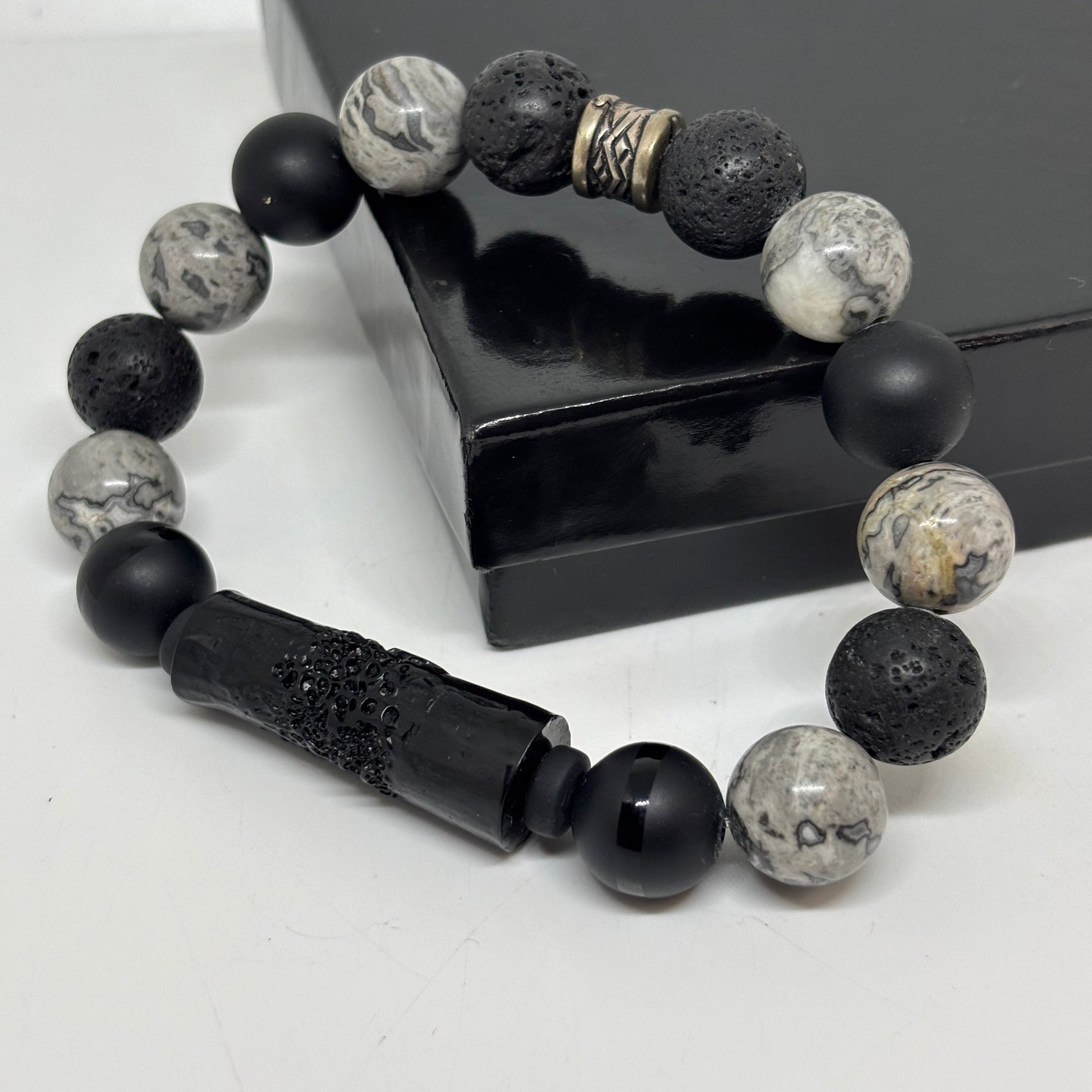 - Bold men’s bracelet features a striking mix of black matte beads, grey marbled jasper, and textured lava stone, finished with a sleek black focal tube bead for a modern edge. Designed to elevate any look, this piece blends rugged style with natural stone elegance. Perfect for everyday wear or a statement accessory.