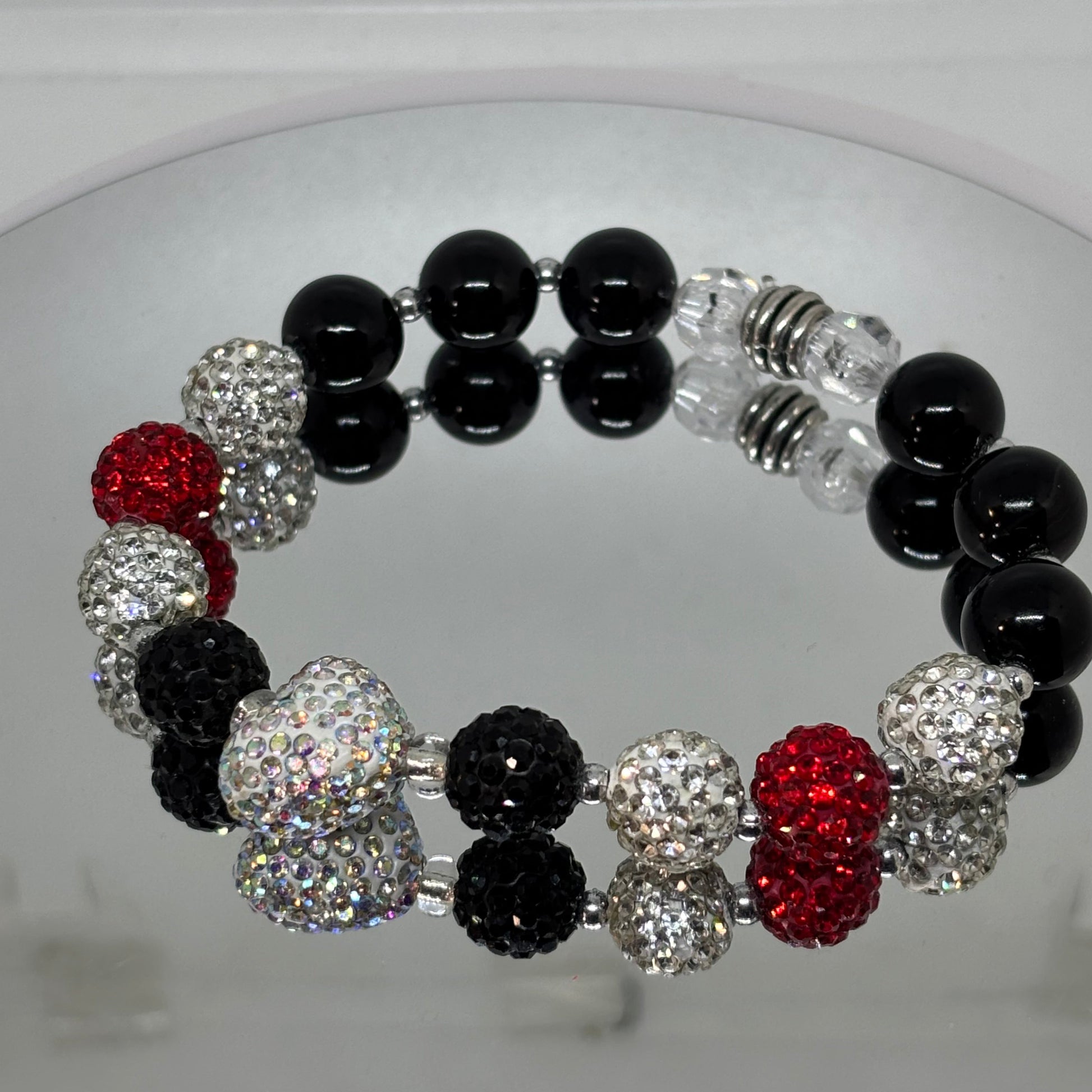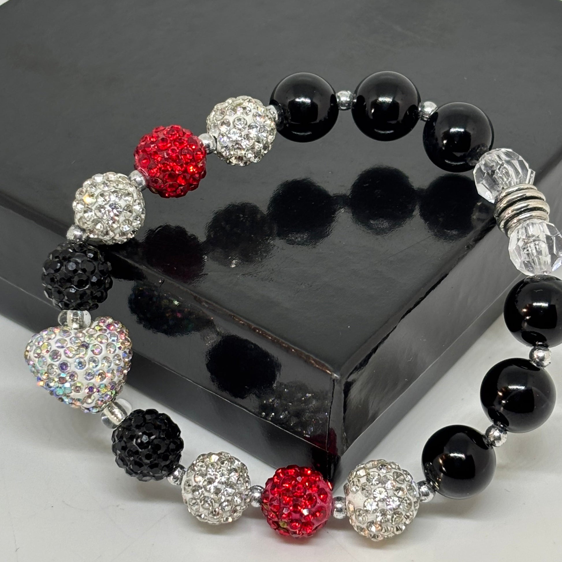 A bold touch of sparkle to your style with this stunning red and black crystal beaded bracelet. Featuring glossy black beads paired with dazzling rhinestone crystal beads in red, silver, and black, this bracelet is designed to stand out while still feeling elegant and versatile.