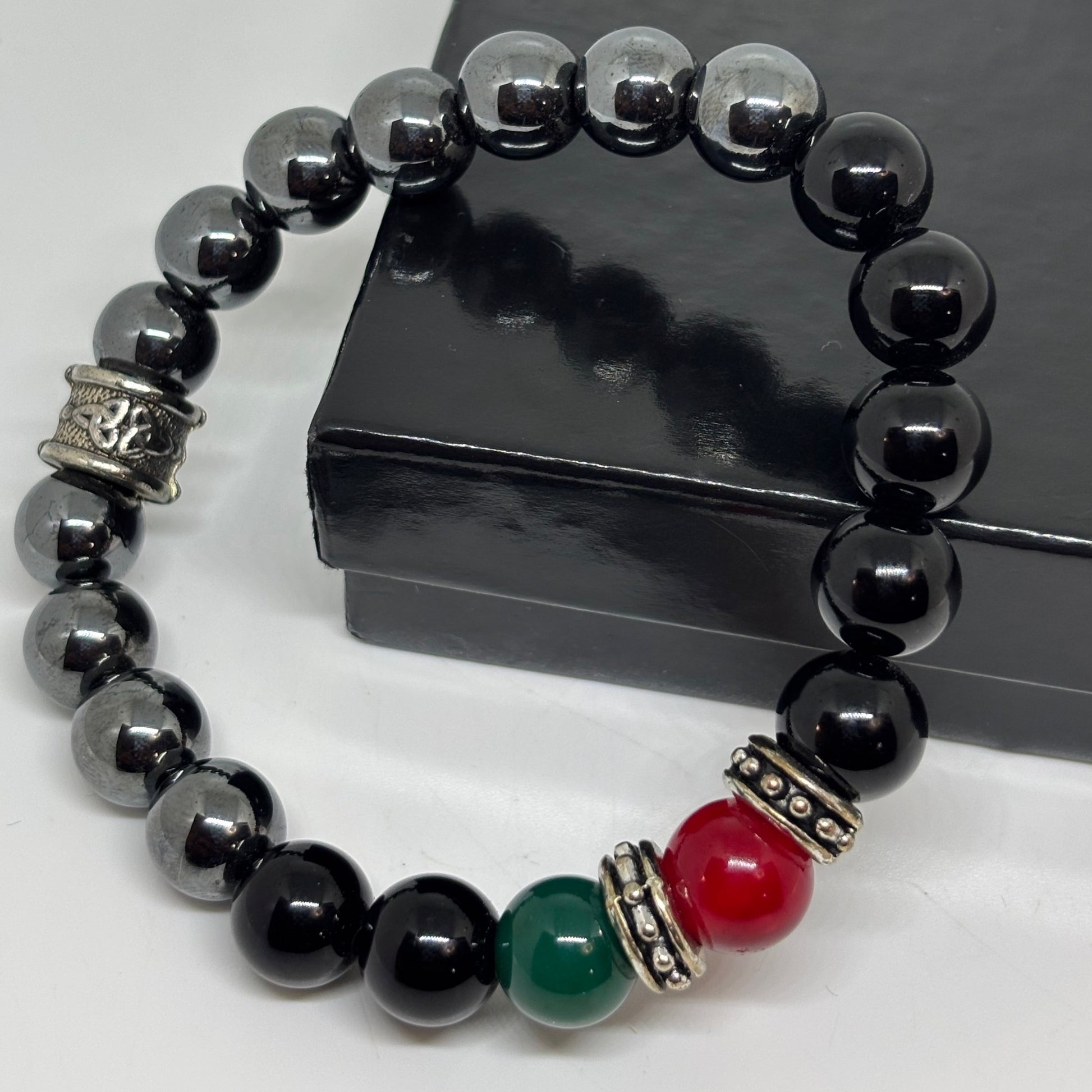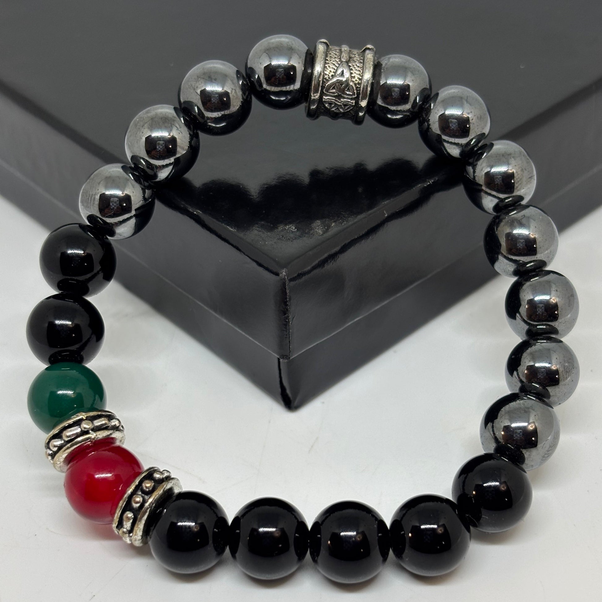 - Inspired sleek Gucci bracelet crafted with glossy hematite and black onyx beads, highlighted with bold red and green accent stones and antique silver spacers. This design represents strength, confidence, and royalty—perfect for men who appreciate luxury with meaning.