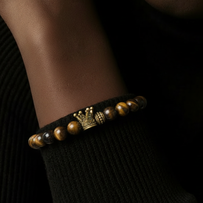 - Tiger Eye beads and finished with a gold crown accent, this bracelet symbolizes strength, confidence, and royalty. A bold statement piece designed to elevate any look—perfect for everyday wear or special occasions.