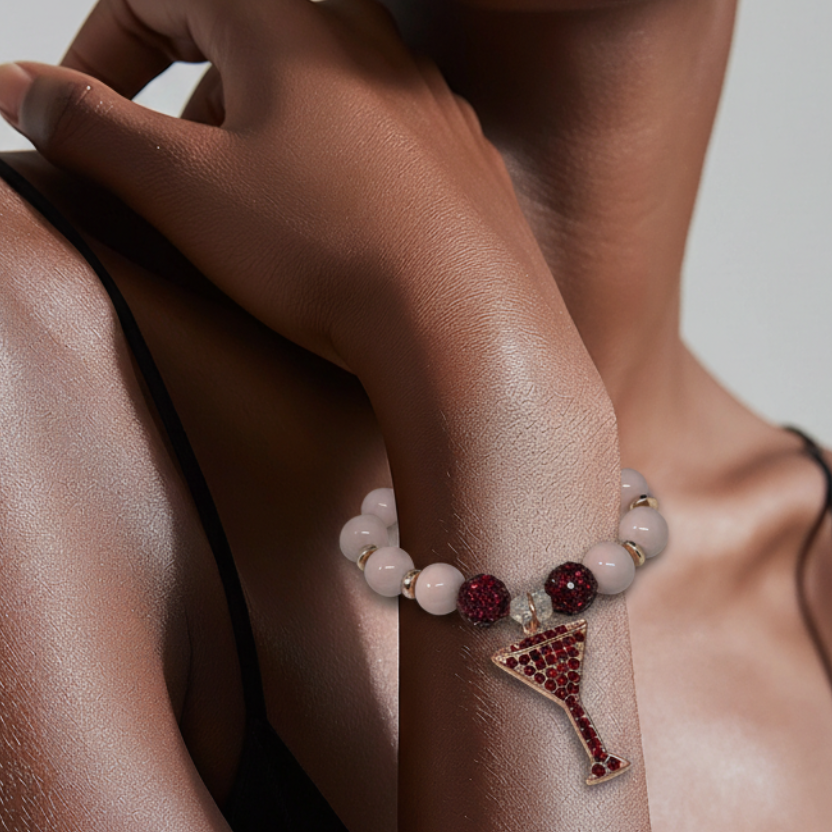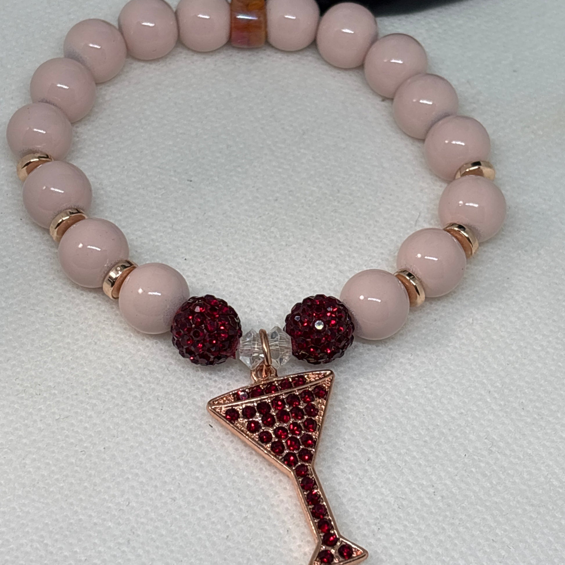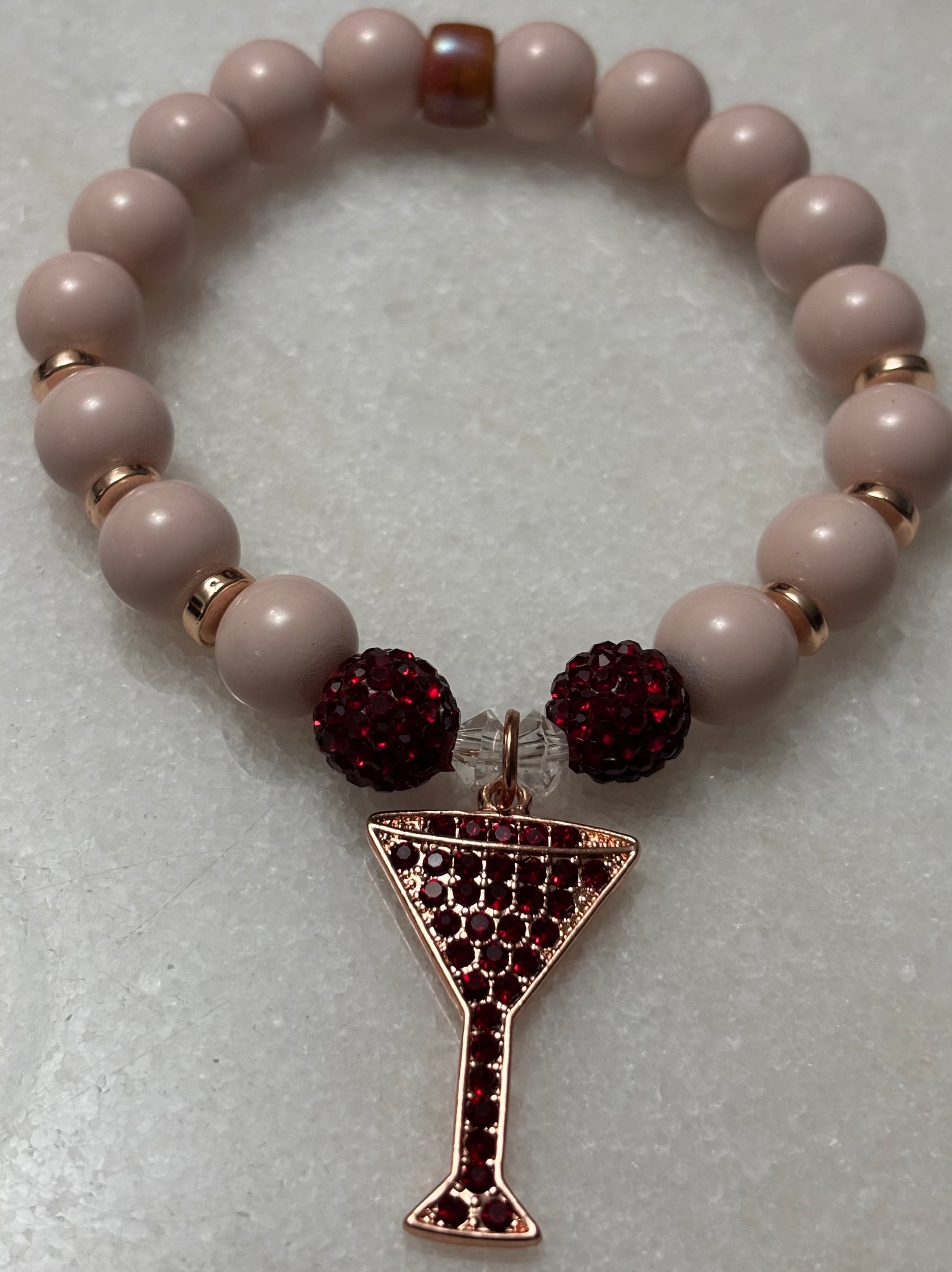 - Soft blush beaded bracelet, accented with rose, gold spacers, deep, red, bling beads, and a sparkling martini, glass charm. Chic, feminine, and perfect for a night out look or cocktail inspired style.
