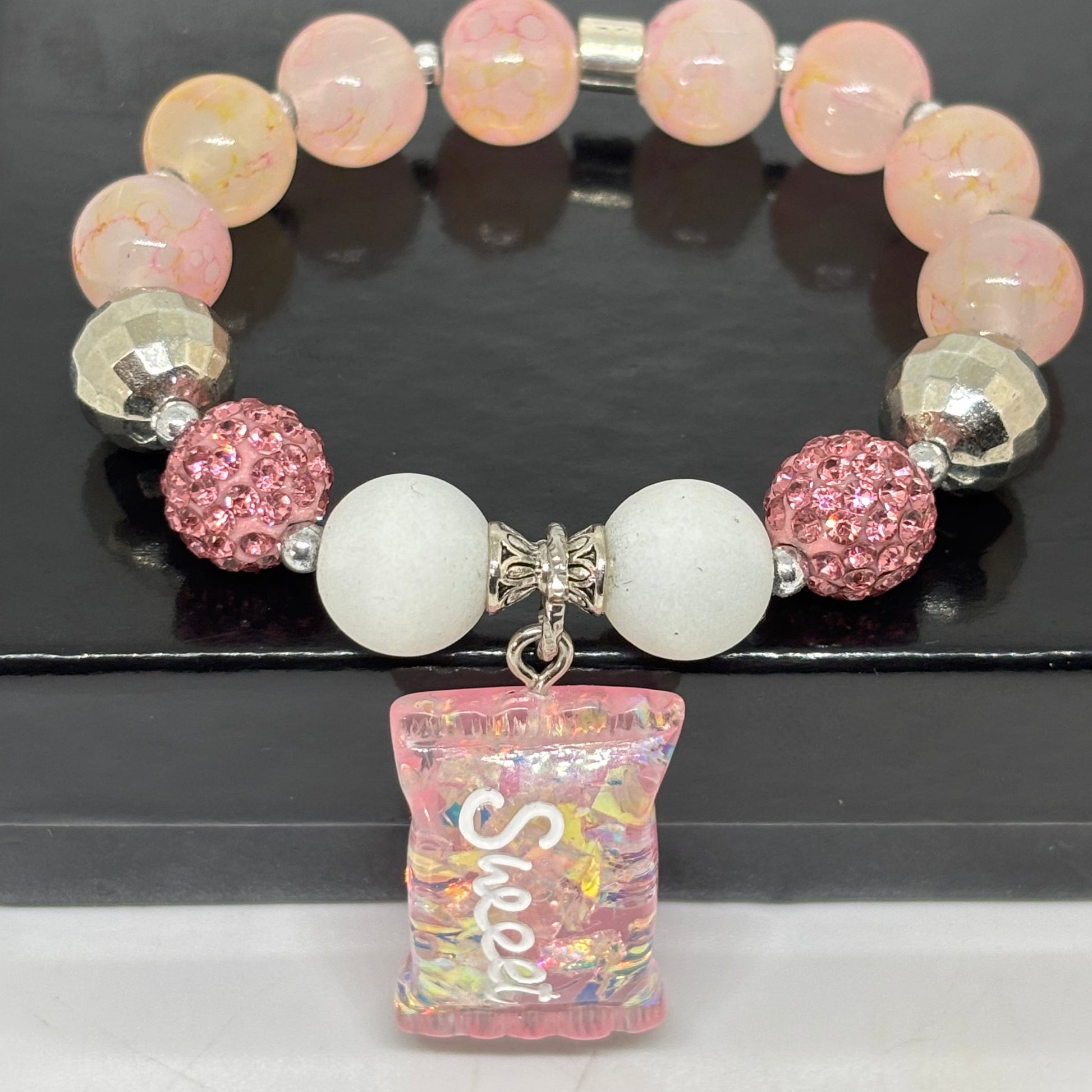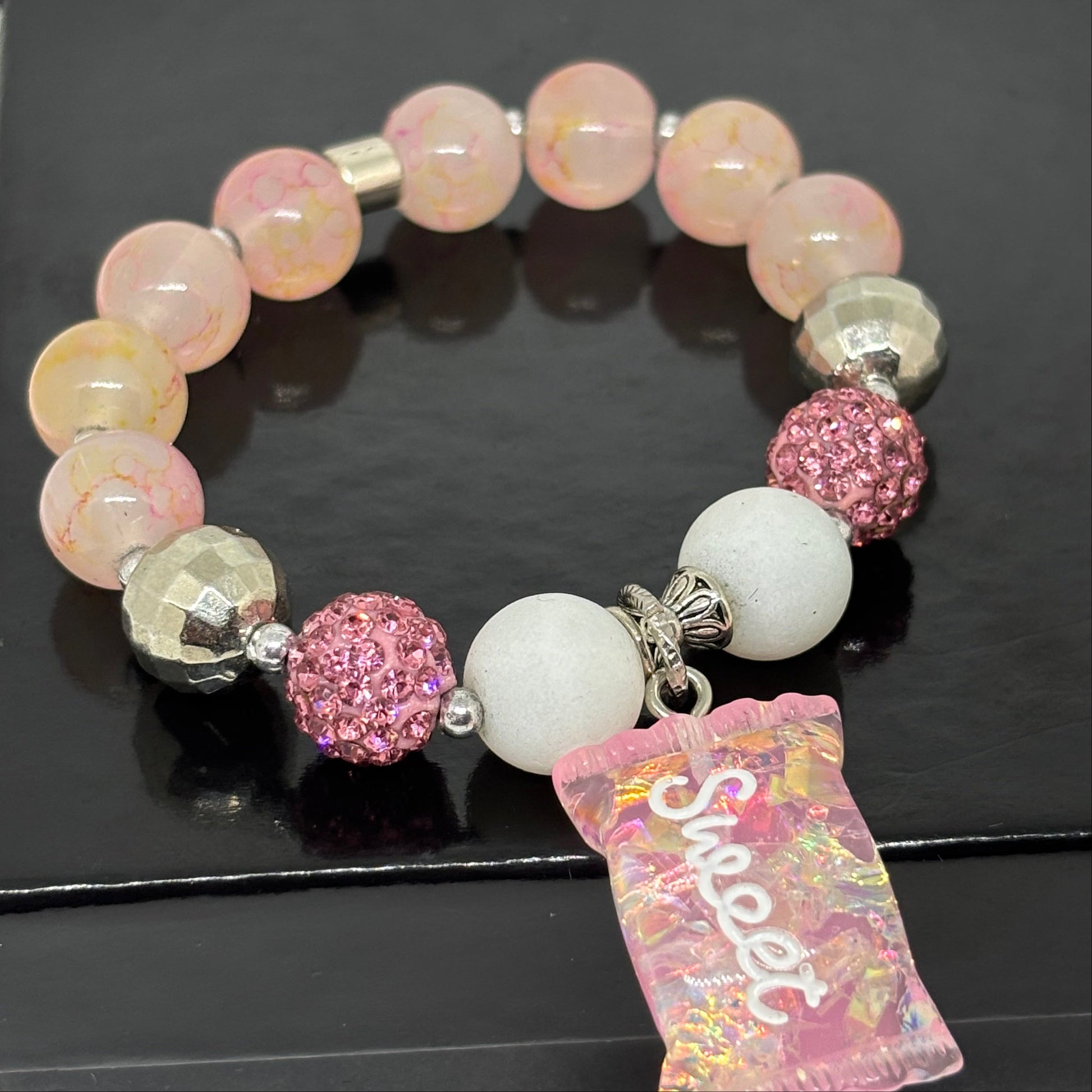 - Pretty, playful, and sweet! This kids bracelet features a hint of yellow & pink beads, sparkling accents, and a cute “Sweet” candy charm perfect for everyday fun or special moments.