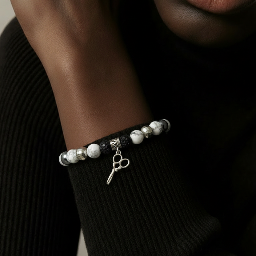 - A bold black and white beaded accented with face metallic spacers and a silver scissor charm. This design, symbolizes, creativity, precision, and confidence, perfect for stylist creators or anyone who values sharp style.