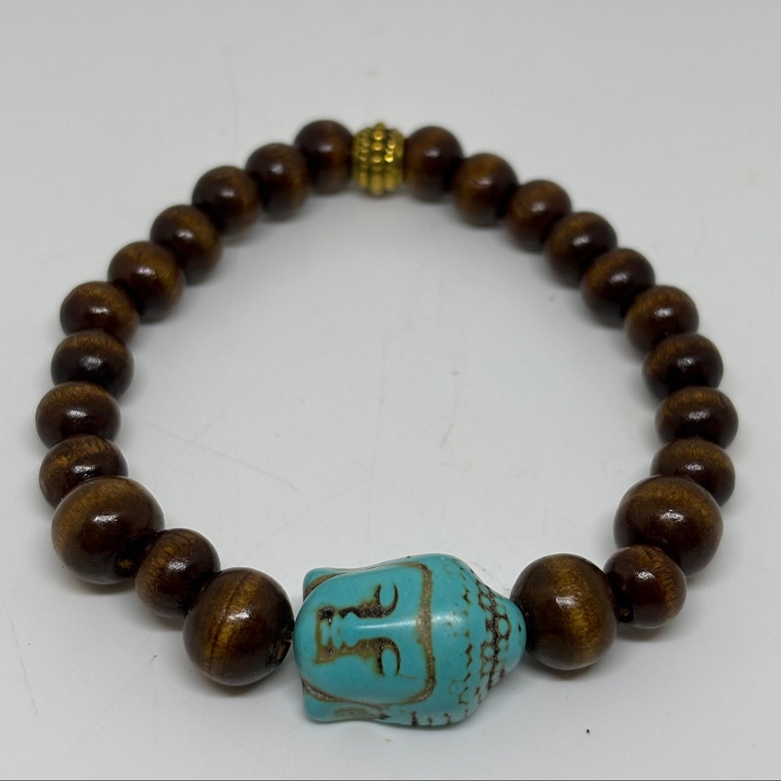 - A spiritual unisex bracelet crafted with rich brown wooden beads and a striking turquoise Buddha charm at its center. Symbolizing peace, wisdom, and grounding energy, this bracelet adds a touch of serenity and mindful style to any outfit.