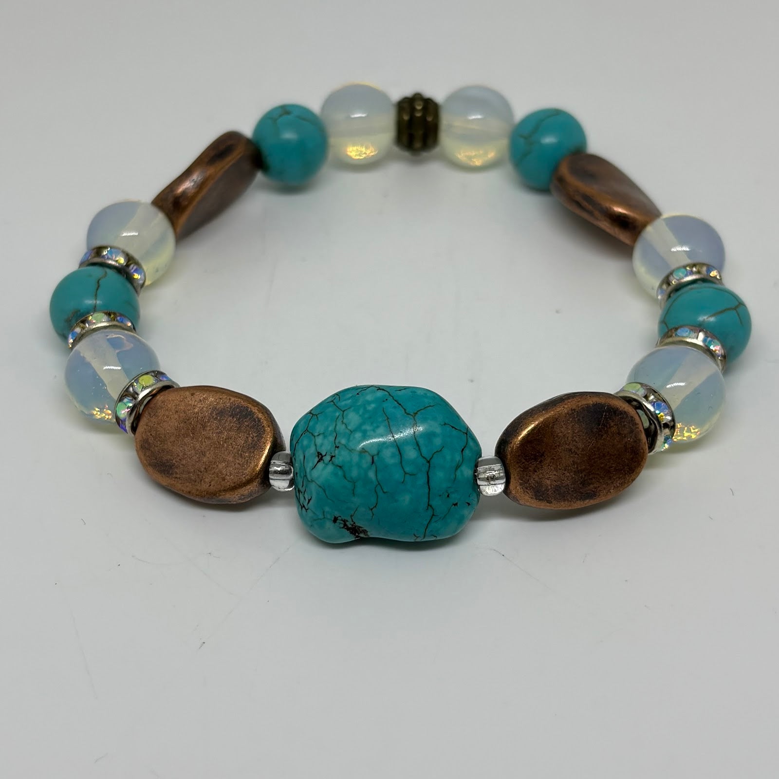 - Chic stretch bracelet featuring turquoise stones, copper-toned accents, and iridescent opalescent beads. A perfect blend of earthy warmth and luminous elegance, ideal for both casual and sophisticated looks.